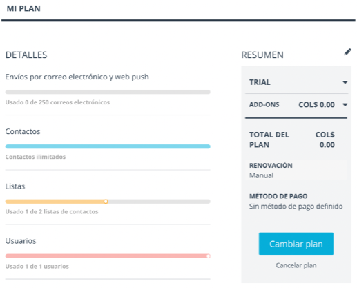 - Gestión de Plan y Saldo: En este se visualizan los detalles del Plan para cada una de las funcionalidades que esta plataforma presenta. Como se muestra en la ilustración-